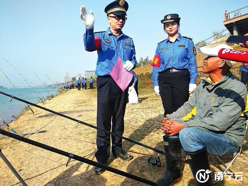 城管队员向垂钓者发放爱护邕江宣传单。记者黎兆齐摄