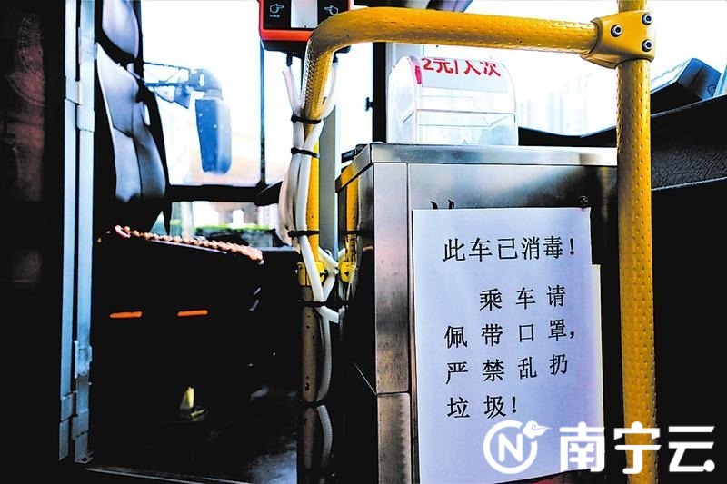 “此车已消毒!乘车请佩戴口罩,严禁乱扔垃圾·”5日上午,记者来到南宁公交集团埌东公交场站,一名驾驶员正在对即将发班的车辆进行消杀作业。公交车上投币处的醒目位置张贴了提醒市民佩戴口罩的提示,同时在车厢内电子显示屏和报站器都设置了提醒。