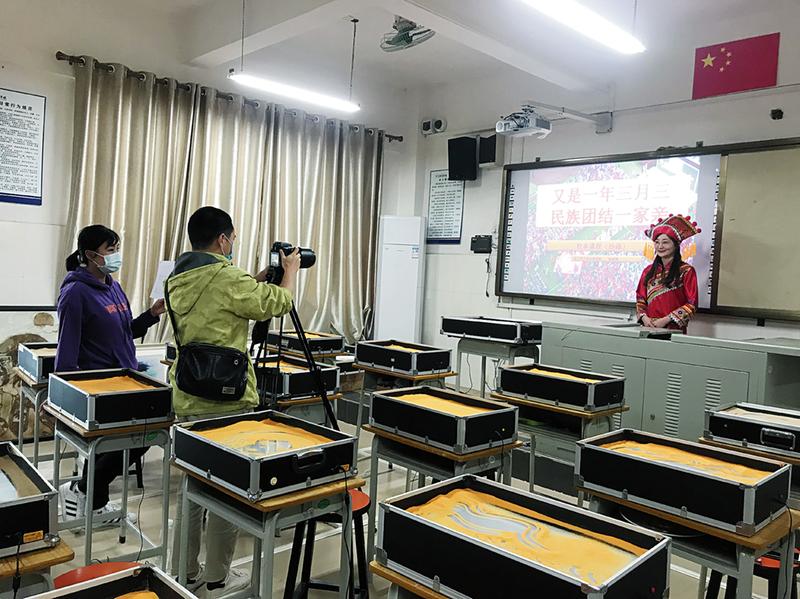 南宁市天桃实验学校银杉校区老师录制“又是一年三月三,民族团结一家亲”空中课堂。雷畅摄