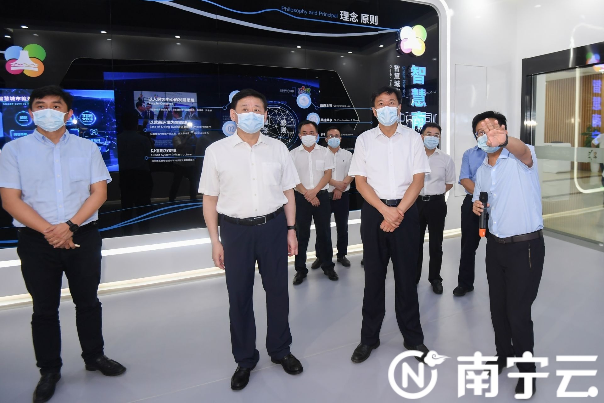6月17日,钦州市考察团一行莅邕考察。图为自治区党委常委、市委书记王小东陪同钦州市考察团在中国—东盟新型智慧城市协同创新中心考察。记者陈麒元摄