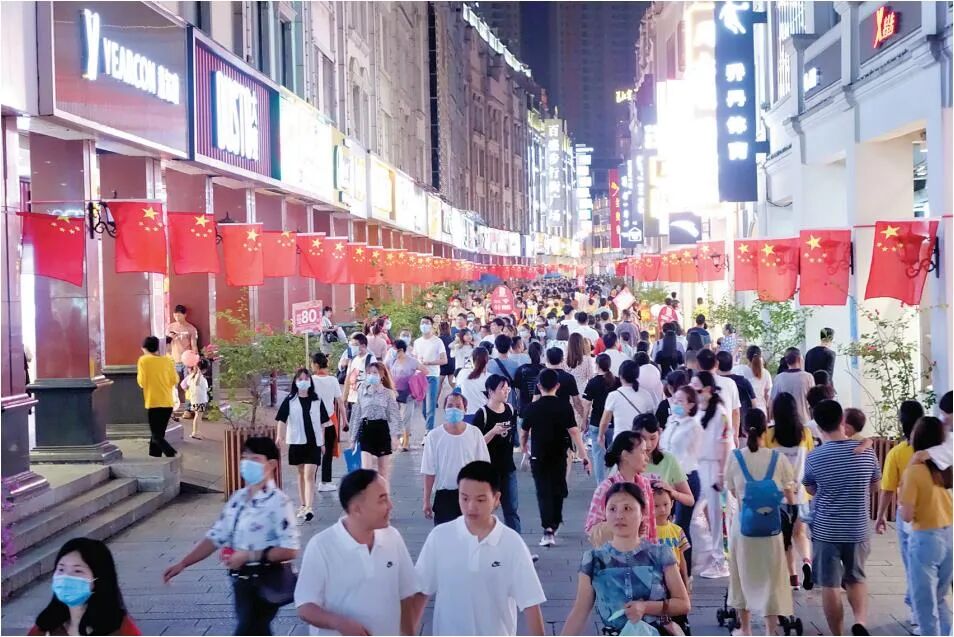 “双节”假期夜间,步行街游人如织。记者梁枫摄