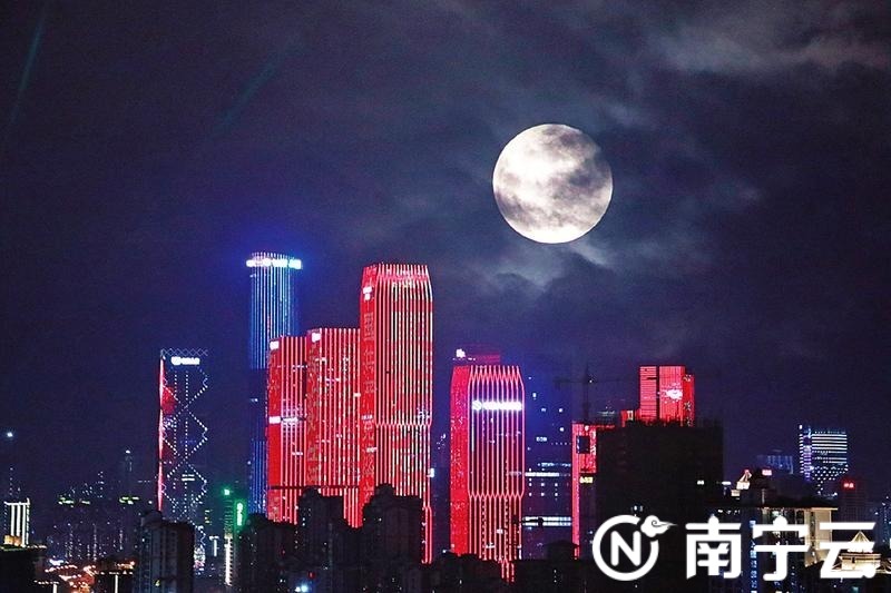 昨晚,南宁夜空出现今年第一次超级月亮。超级月亮是指近地点时的满月,此时月亮不仅圆满,而且视直径最大。今年4月27日11时32分(望),月球、地球和太阳排列成近似一条直线,月亮最圆。记者程勇可摄