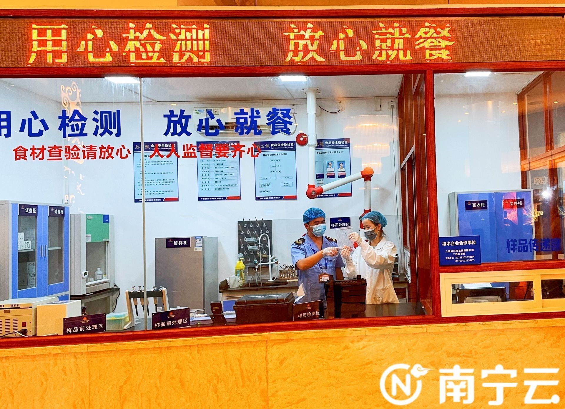 2013年,会展中心好友缘国宴饭店成立食品快检室,配备专业快检人员,使用科学手段、仪器对食品原材料开展检测工作,分析是否存在有害物质残留、重金属污染、生物毒素污染等情况。全面收集、汇总相关食用农产品的质量自检信息,并设置公示牌公开农残检测项目、结果等。对于不合格的食材,进行现场销毁并通知食品供应商进行现场签字确认,责任划分。同时,检测结果将会同步上传至市场监管部门,共同清理餐饮服务安全隐患,筑牢南宁餐饮业食品安全防线。