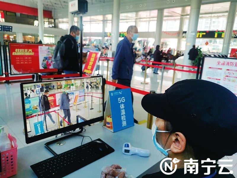 近日,记者来到南宁市埌东汽车站看到,乘客佩戴好口罩,向工作人员出示二维码后,经过车站的5G自动测温仪实时测温,即可快速进站,保证乘客的乘车安全与通行效率。在候车大厅内,电子大屏、广播、海报等大力宣贯疫情防控知识,营造防疫的良好氛围。