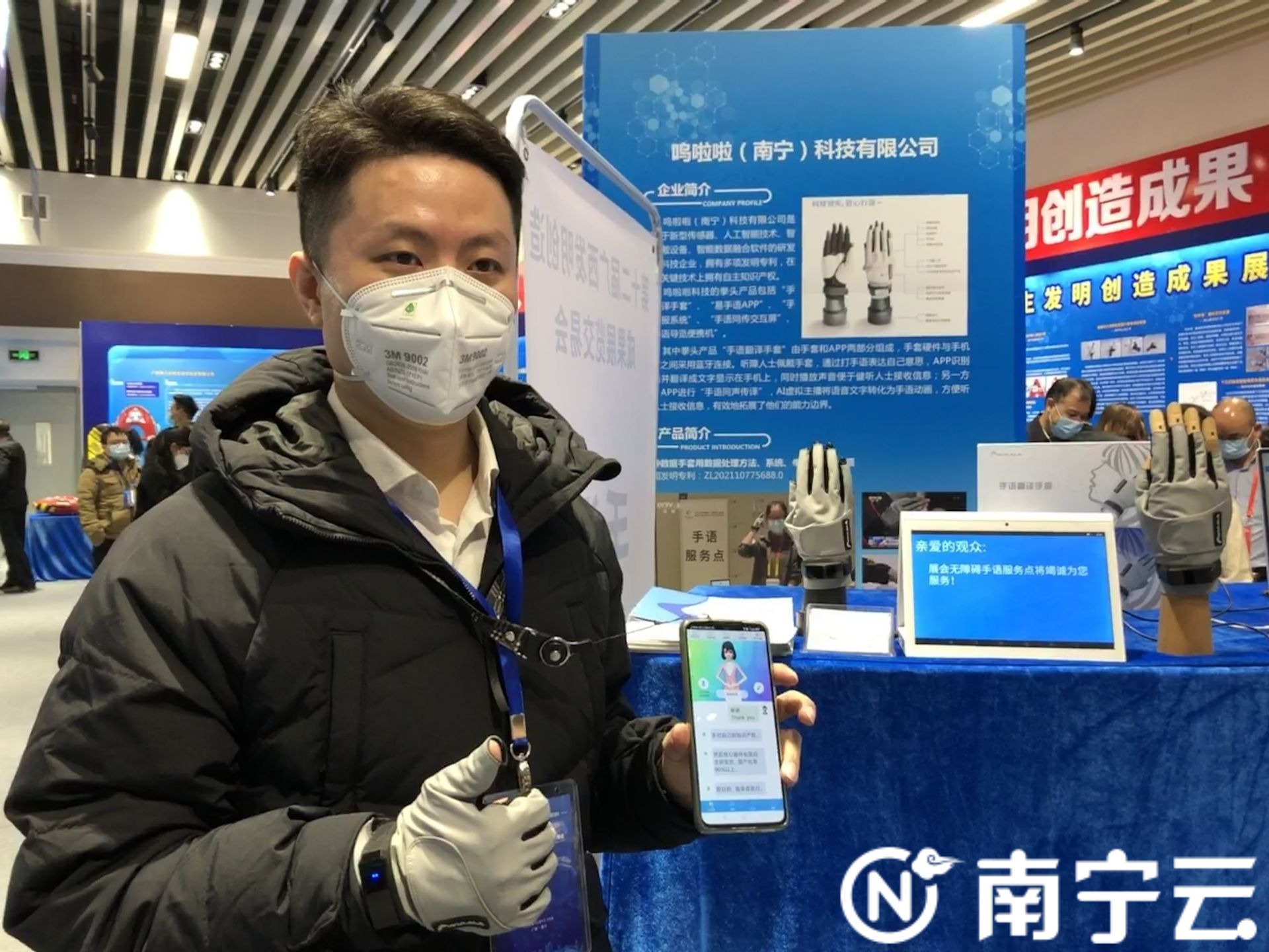 “这款手套是全球第一款手语翻译手套量产产品。”展台负责人于维佳说,整个产品由手套和 APP两部分组成,手套硬件与手机 APP之间采用蓝牙连接。听障人士佩戴手套,通过打手语表达自己意思,APP识别手语并翻译成文字显示在手机上,同时播放声音便于健听人士接收信息;另一方面,APP进行“手语同声传译”,AI虚拟主播将语音文字转化为手语动画,方便听障人士接收信息,有效地帮助听力障碍者的生活、教育和就业。