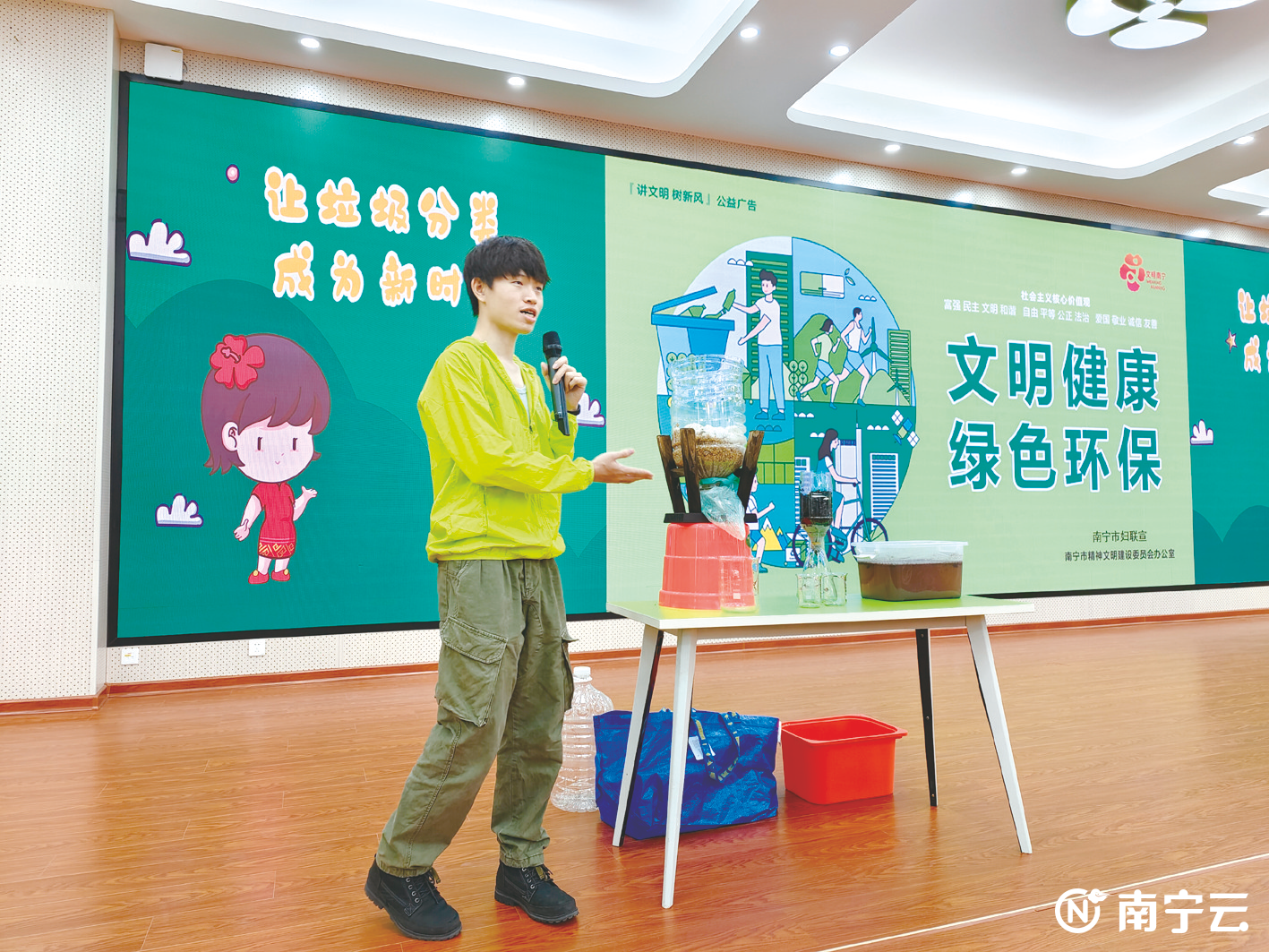 昨日,在首个“全国城市生活垃圾分类宣传周”期间,由南宁市妇联、南宁市垃圾分类办主办的“让垃圾分类成为新时尚”主题宣传活动走进那考河社区,通过巾帼大学习、巾帼大宣讲、科普公益课堂等形式,向广大妇女儿童和家庭宣传绿色环保、生态文明理念,倡导科学规范进行生活垃圾分类,以实际行动践行绿色低碳生活理念。